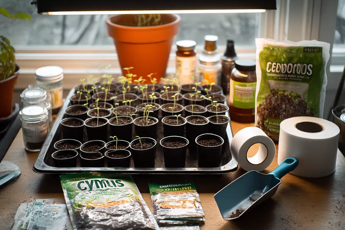 Сначала посев: в 200 мл стаканчики по 2–3 семечка. После всходов оставляем сильный росток. Грунт: верховой торф 70–75 % + перлит + вермикулит + циммус для рассады. Полив эликсиром: фитоспорин + янтарная кислота + аминоцимус. Это обеззараживает и стимулирует рост. Накрываем плёнкой, ставим под лампы — всходы быстрые и здоровые.