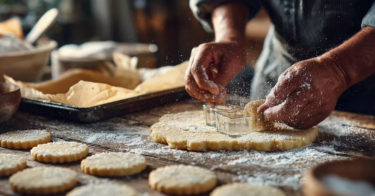 Стол присыпаем мукой. Раскатываем тесто толщиной ≈7 мм. Вырезаем коржики стаканом или формочкой (диаметр на ваш вкус). Обрезки собираем, снова раскатываем и вырезаем. Одну сторону каждого коржика обмакиваем в сахар и выкладываем на противень сахаром вверх. Выпекаем в разогретой до 180 °C духовке 15 минут. Не передерживайте — коржики должны остаться мягкими внутри, с лёгкой хрустящей корочкой.