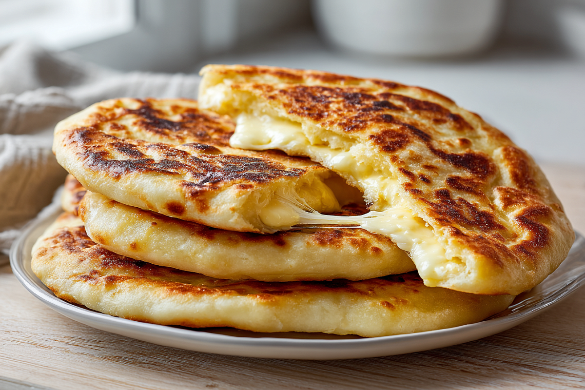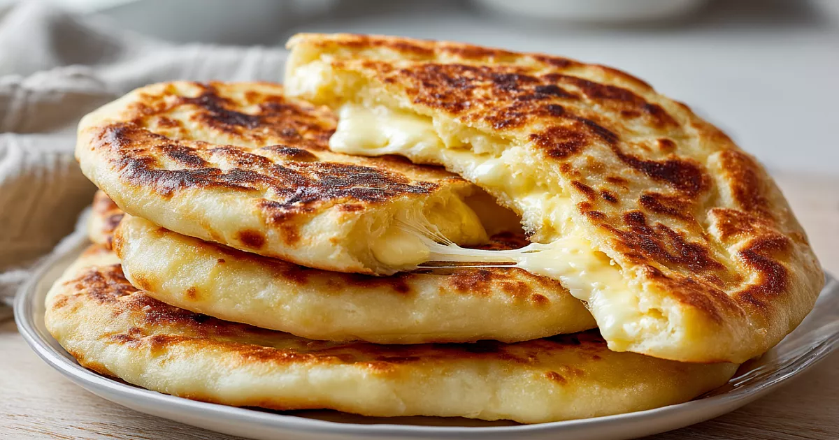 Тесто делим на 4 части. Каждый кусочек раскатываем в тонкую лепёшку (≈3–4 мм). В центр кладём сырный шарик, придавливаем и защипываем края плотно, как беляш. Слегка расплющиваем руками или скалкой до толщины ≈1 см. Жарим на сухой хорошо разогретой сковороде (средний огонь) под крышкой по 3–4 минуты с каждой стороны до золотистой корочки. Переворачиваем аккуратно лопаткой. Горячие можно смазать сливочным маслом.