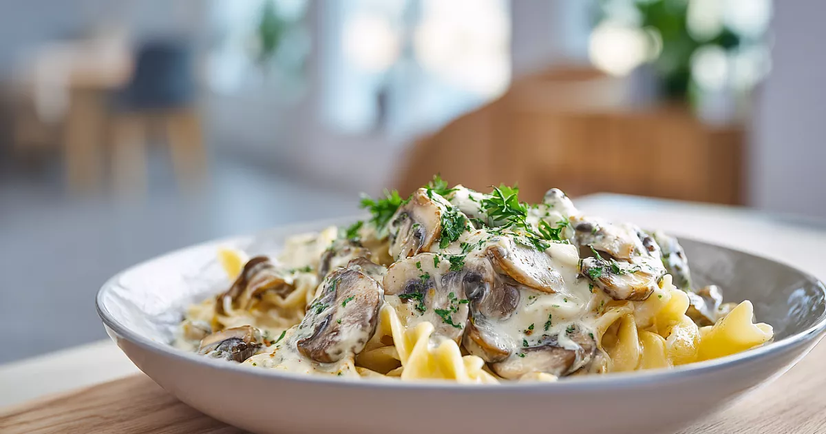 Это очень простой и ароматный ужин: макароны, шампиньоны, лук и плавленый сыр превращаются в нежное блюдо с кремовым соусом. Готовится за 20 минут в одной сковороде.