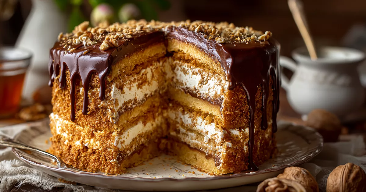 Это настоящий хит — медовый торт с орехами и нежным сметанно-сливочным кремом. Готовится просто, выглядит празднично — отличная альтернатива медовику.
