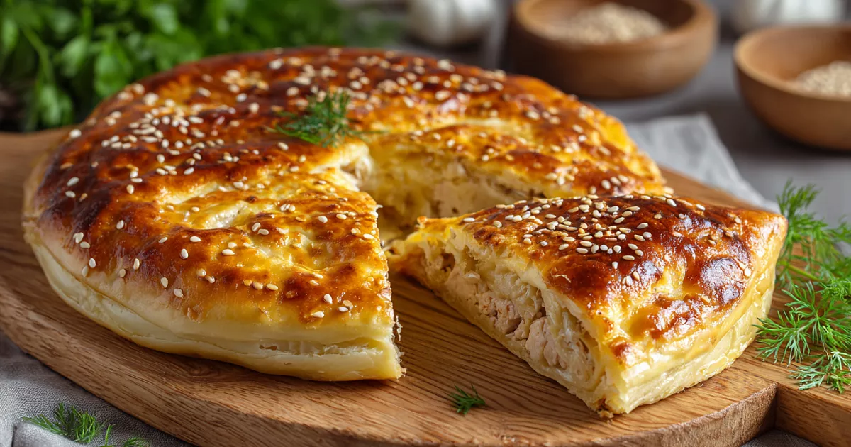 Разделите тесто пополам. Каждую часть подкатайте в шар и оставьте ещё на 7–10 минут. Раскатайте одну половину в круг диаметром 25–27 см. Выложите на противень с тефлоновым ковриком или пергаментом. Равномерно распределите начинку, отступая от краёв по 0,5 см. Вторую половину раскатайте и накройте начинку. Защипните швы плотно, сделайте красивый край. В центре прорежьте небольшое отверстие для выхода пара. Смажьте яйцом с водой и посыпьте кунжутом по желанию. Выпекайте в разогретой до 180 °C духовке 30 минут режим верх-низ с конвекцией. Пирог зарумянится, начинка станет сочной.