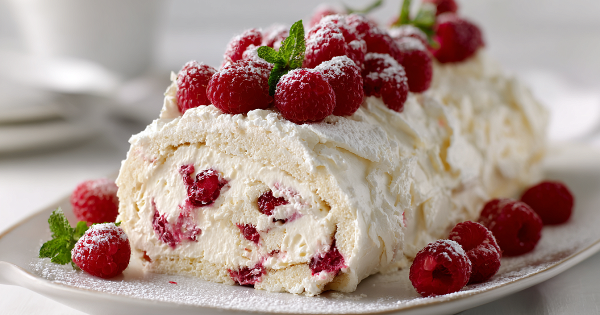 180 г пастообразного сыра (или густого греческого йогурта) смешайте с подсластителем по вкусу, 1 ч. л. лимонной цедры и 1 ч. л. лимонного сока. Хорошо перемешайте до однородности. Готовый корж снимите с пергамента — он легко отходит. Смажьте кремом по всей поверхности. Сверху выложите замороженную или свежую малину (или любые другие ягоды/фрукты). Аккуратно заверните в рулет. Оставьте на 30 минут, чтобы ягоды растаяли, а десерт немного пропитался.