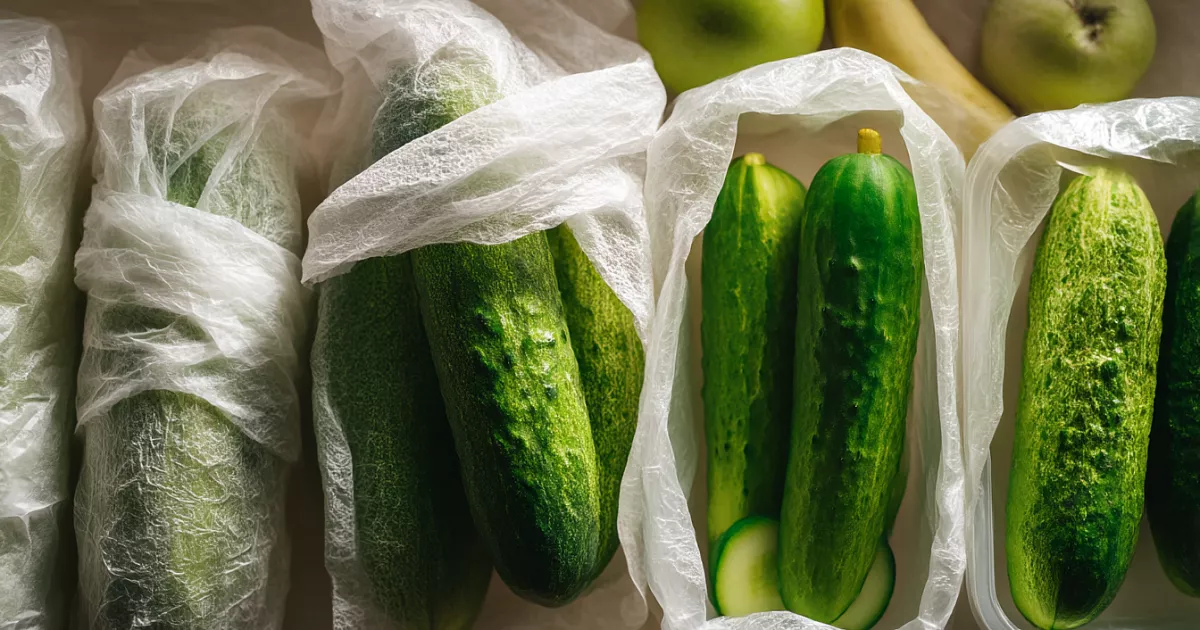 Перед хранением их лучше не мыть, а просто протереть сухой тканью, затем каждый огурец завернуть в бумажное полотенце, которое заберёт конденсат, и сложить в пакет, оставив его не полностью закрытым, чтобы внутри не накапливалась сырость.