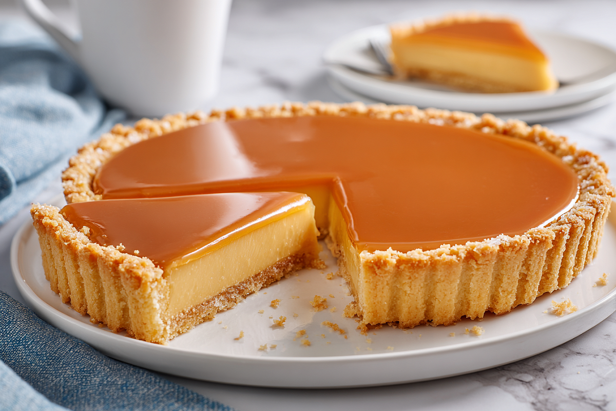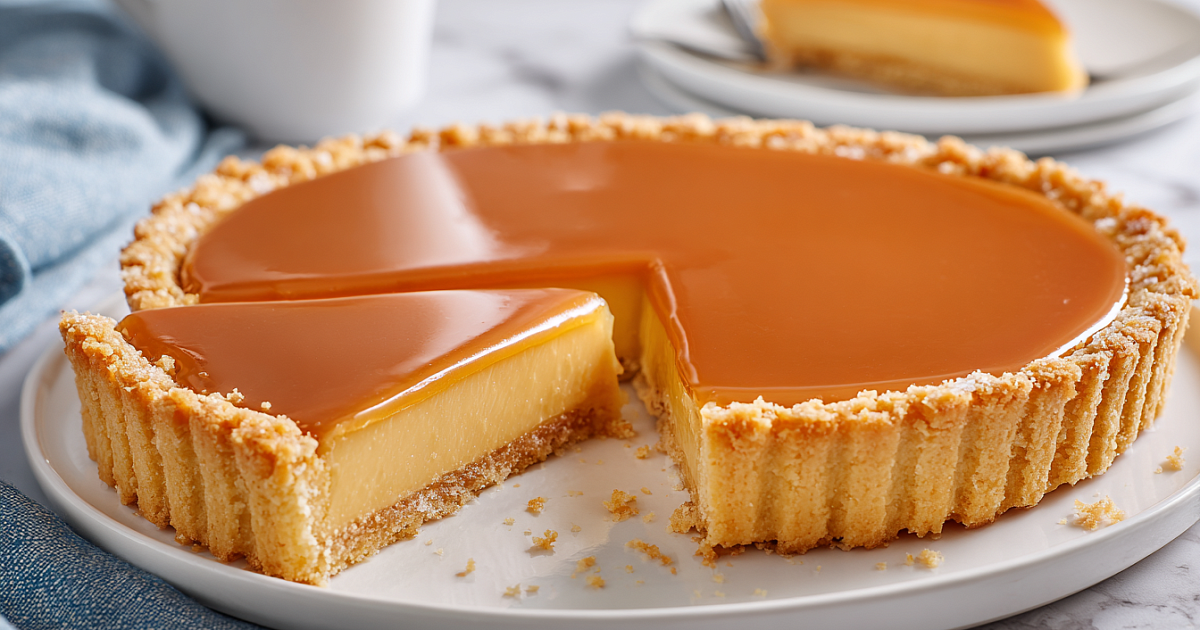 Вкусный песочный пирог с карамельной заливкой из варёной сгущёнки и сметаны. Хрустящая основа, нежная, ароматная начинка — настоящий десертный шедевр. Простой рецепт, который покорит всех.