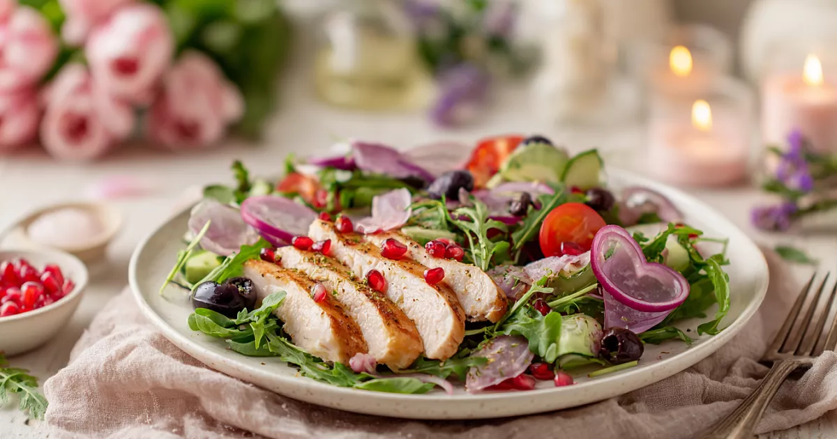 Получается невероятно нежный, свежий и красивый салат с сочной курицей, хрустящими овощами и лёгкой заправкой. Всё гармонично сочетается — идеально для романтического ужина 14 февраля.