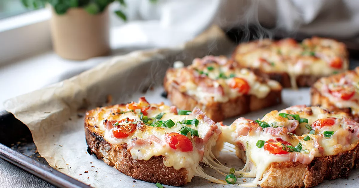 Запекайте в разогретой до 170 °C духовке 15 минут до золотистой корочки и расплавленного сыра. Готовые тосты получаются хрустящими по краям, сочными внутри, с ярким вкусом чеснока, горчицы и копчёностей. Подавайте горячими — это настоящий хит!