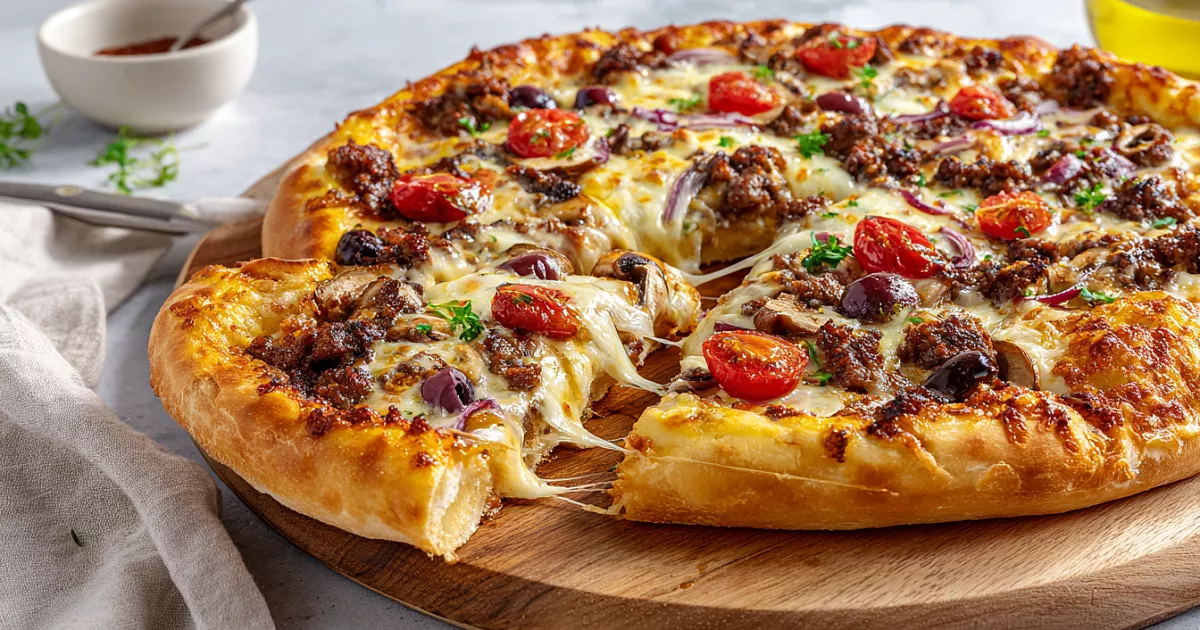 Разделите тесто на 2 части (по ≈600 г). На присыпанном манкой столе растяните каждую часть руками в круг диаметром ≈38 см (бортики оставьте толще). Перенесите на сухую форму/противень/сетку для пиццы. Смажьте томатным соусом (≈5 ст. л. на пиццу), посыпьте орегано. Выложите сыр моцарелла, фарш, лук, грибы, перец, помидоры, оливки и маслины. Сверху ещё немного сыра и капельку оливкового масла. Выпекайте в максимально разогретой духовке (250 °C) 8–10 минут до румяных бортиков и расплавленного сыра.