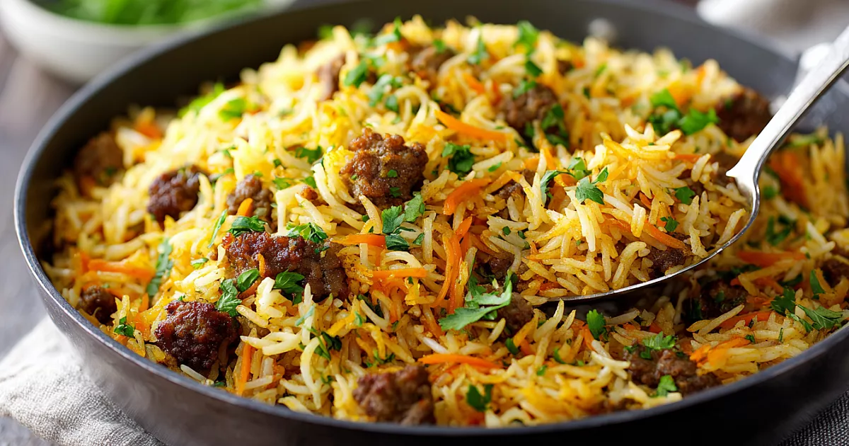 Получается невероятно ароматный, рассыпчатый и сочный рис с мясом — блюдо, которое выручает, когда нет времени, но хочется накормить семью по-царски! Всё в одной сковороде за 30 минут, минимум возни, максимум вкуса.