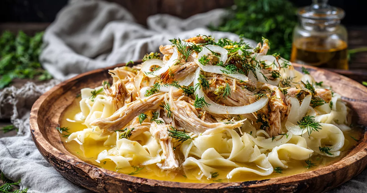 200–300 г яичной лапши (или листы лазаньи) отварите по инструкции на упаковке (обычно 8–10 минут). Мясо разберите на волокна (можно руками или двумя вилками). Выложите лапшу на большое блюдо, сверху — мясо, полейте горячим бульоном (по желанию — отдельно в пиале). Посыпьте маринованным луком, рубленым укропом и петрушкой. Добавьте свежемолотый чёрный перец и по желанию острый перец.