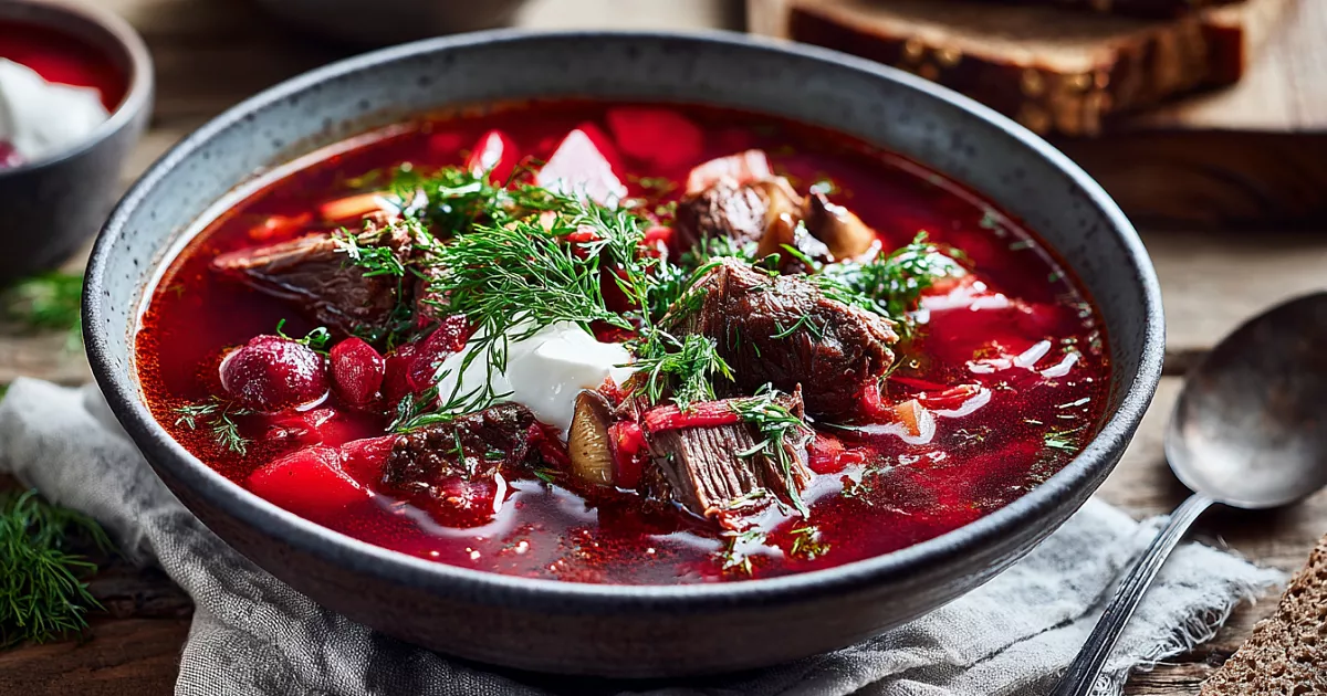 Насыщенный, густой и вкусный борщ: мясо тает во рту, свёкла даёт ярчайший цвет, вишня добавляет лёгкую фруктовую кислинку, белые грибы — зимний лесной аромат, а топлёное масло делает вкус по-настоящему родным и домашним.