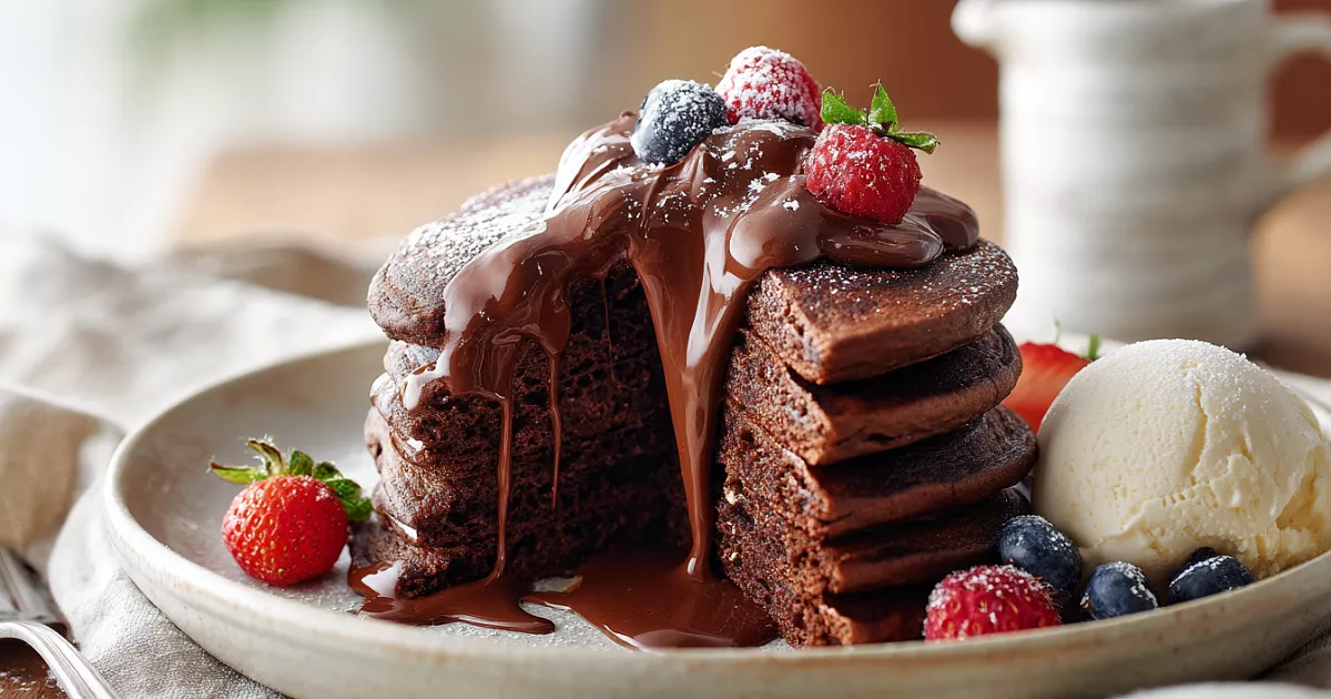 Получаются самые нежные, воздушные и шоколадные панкейки в мире — без единого комочка, с идеальной пористостью и насыщенным вкусом какао! Сверху горячий сливочно-шоколадный соус.
