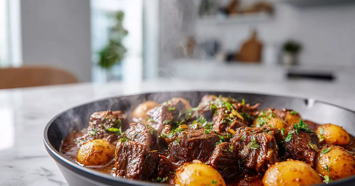 Получается невероятно ароматное, сочное и сытное блюдо: говядина тушится в собственном соку с овощами и специями, картошка остаётся целой, золотистой и пропитанной всеми ароматами, а соус густой и насыщенный — это не просто ужин, это настоящий хит!