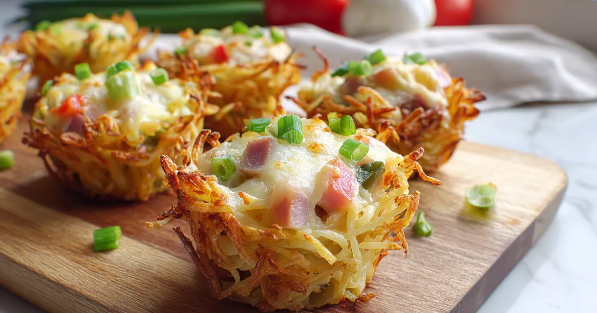 Получается невероятно аппетитный, быстрый и сытный ужин: золотистые картофельные гнёзда с хрустящей корочкой, внутри нежная овощная начинка с ветчиной, яйцом и сыром, который тянется!