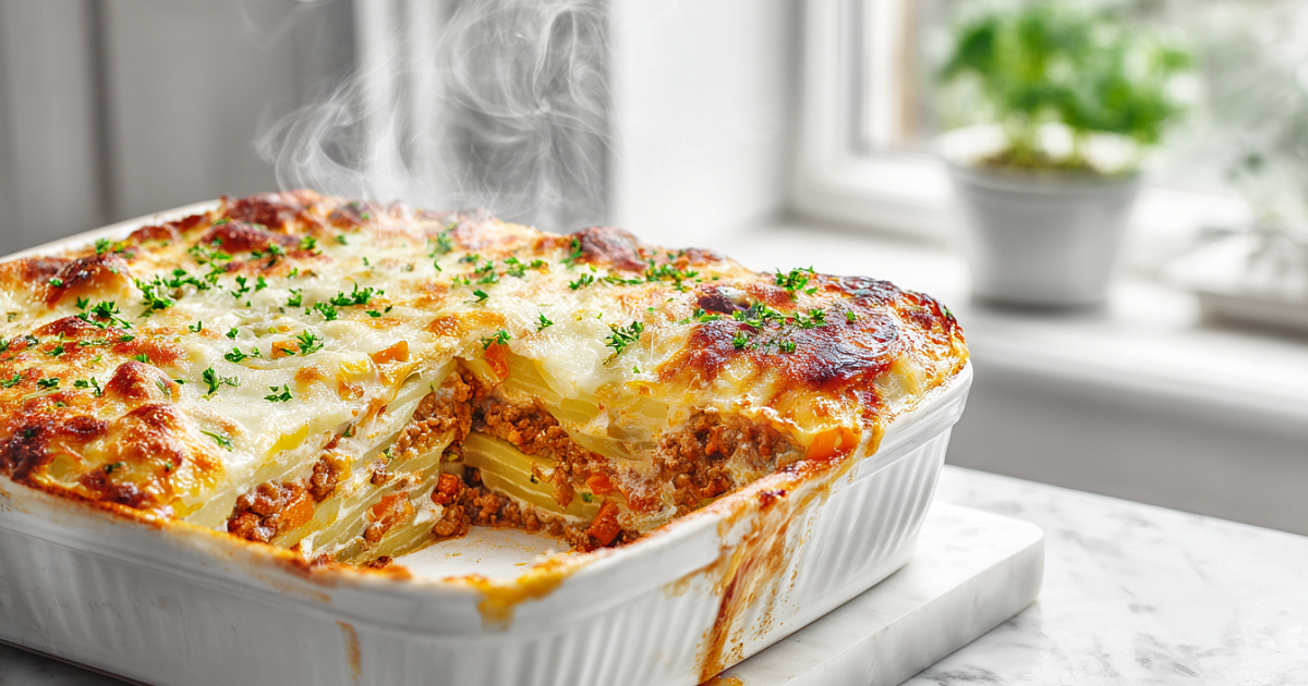 Когда хочется приготовить что-то сытное и вкусное из простых продуктов, эта картофельная запеканка всегда выручает. Получается нежной, сочной, с вкусной мясной прослойкой и золотистой сырной корочкой сверху.