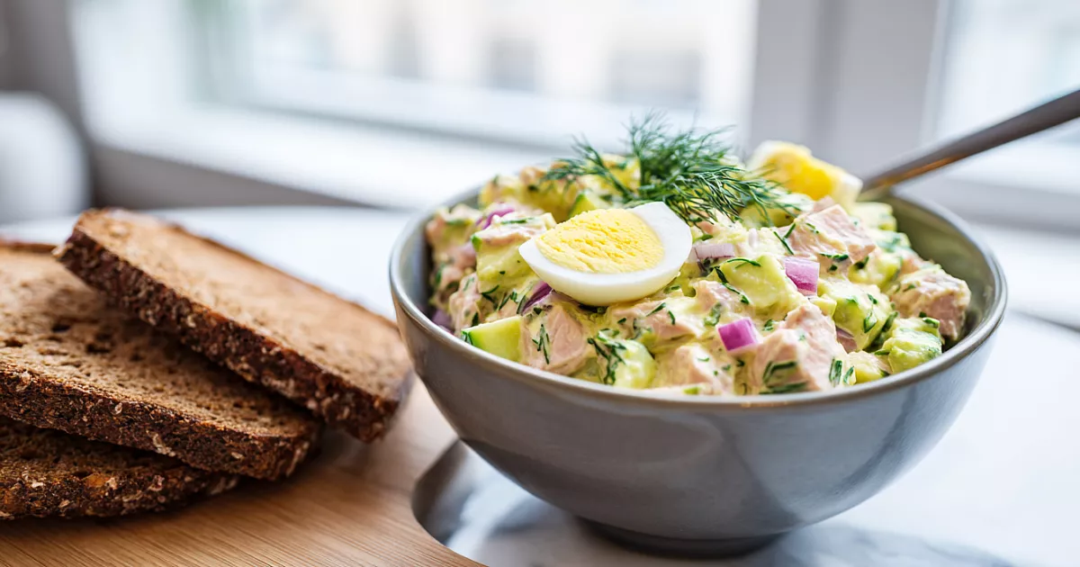 Всё соединяем в миске: яйца, тунец, авокадо, лук, огурец и зелень. Добавляем 2–3 щепотки чёрного перца, половину чайной ложки соли и 2 чайные ложки лимонного сока. Вливаем 80 г греческого йогурта — он делает намазку полезной и нежной. Если хочется ярче вкуса, можно взять немного майонеза. Хорошо перемешиваем до однородности. Пробуем на соль и кислинку — при необходимости подправляем. Готовая намазка получается сочной, свежей, с ярким вкусом каждого ингредиента: тунец, авокадо, яйца и огурец дают приятную свежесть.