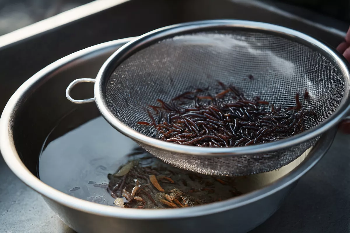 Ещё лучше — прогнать через ситечко. Есть специальные с двойным ситом: крупное и мелкое. Через крупное уходит мусор и повреждённый мотыль, через мелкое — очень мелкий кормовой. Остаётся только крепкий, яркий, идеальный для крючка.