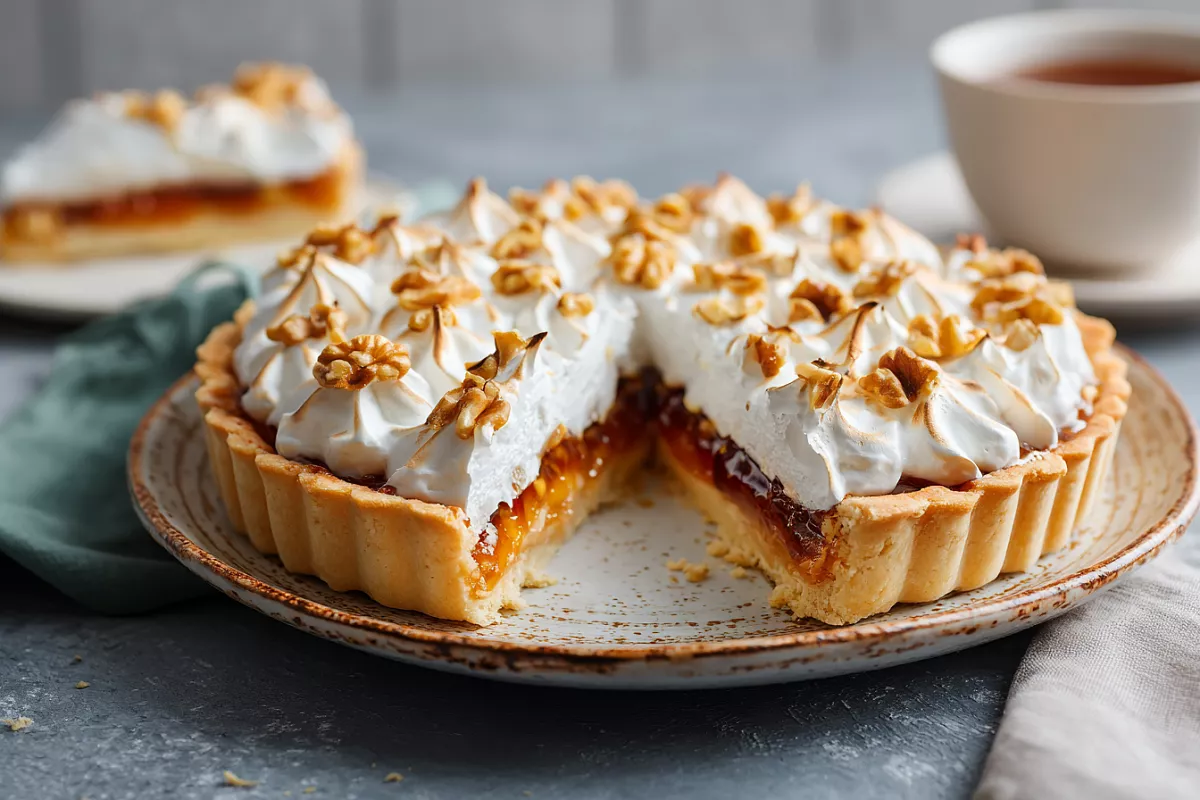 Этот пирог — настоящее наслаждение: хрустящая песочная основа, нежная меренга и кисло-сладкое варенье с орешками. Готовится просто, выглядит красиво и невероятно вкусно — идеально к чаю или празднику.