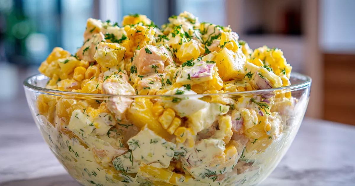 Все ингредиенты выкладываем в красивый салатник, аккуратно перемешиваем с заправкой, стараясь сохранить форму кусочков. Главный секрет: заправку добавляйте прямо перед подачей — салат не потечёт и останется свежим. Подаём в салатнице, порционно в креманках или через кольцо горкой. Украшаем ананасом, кукурузой или зеленью — выглядит празднично и аппетитно.