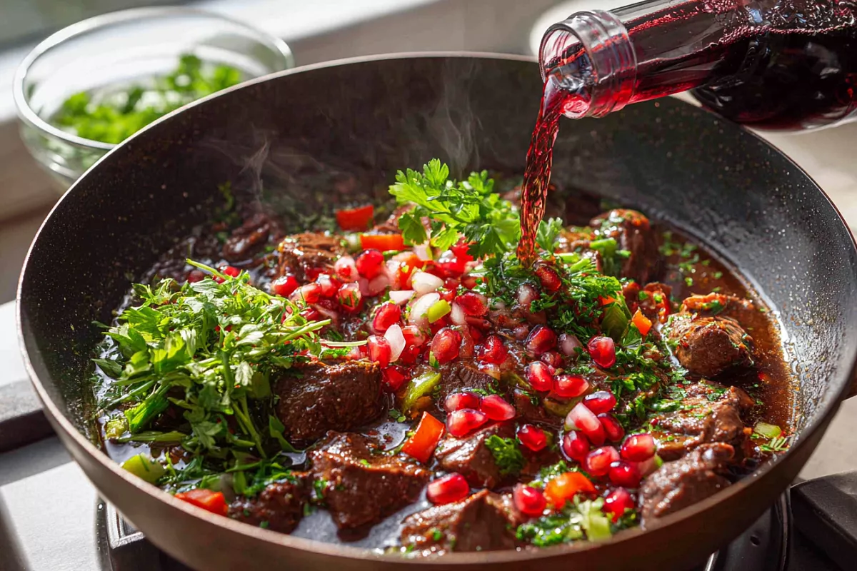 Вливаем 150 мл красного сухого вина, выпариваем лишнюю влагу, оставляя только цвет и вкус. В конце добавляем 4 зубчика чеснока через пресс, мелко нарезанную кинзу 50 г и петрушку 30 г, прогреваем 5 минут. Посыпаем гранатовыми зёрнами — кисло-сладкие гранаты идеально дополняют пряность.
