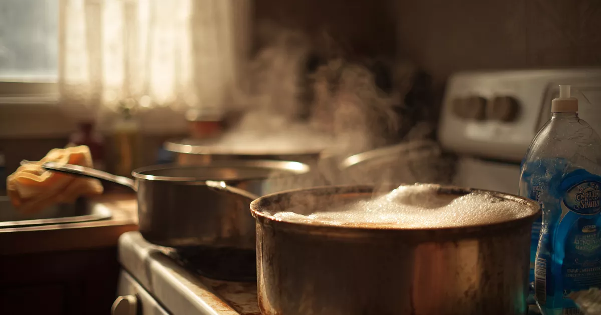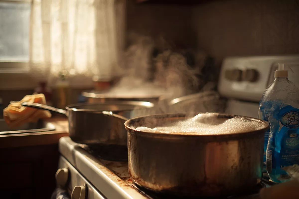 Налейте в большую ёмкость горячую воду (до половины). Добавьте 2 стакана соды, 1 стакан отбеливателя и 1 стакан средства для мытья посуды. Перемешайте — пойдёт пена. Погрузите грязную посуду (кастрюли, противень, сковороду). Если не помещается — заливайте по частям. Поставьте на огонь и доведите до кипения. Кипятите 15–30 минут (чем толще нагар — тем дольше). Загрязнения размягчаются, пригар отходит сам.