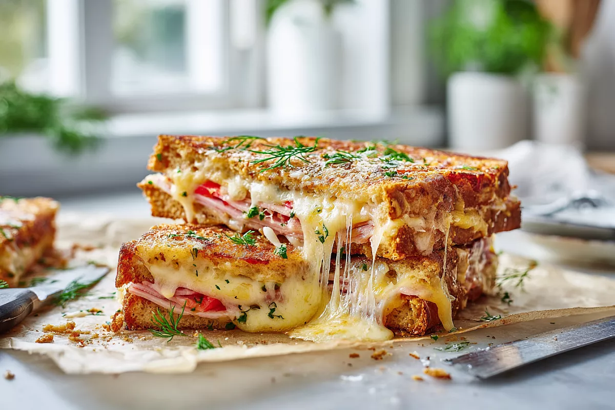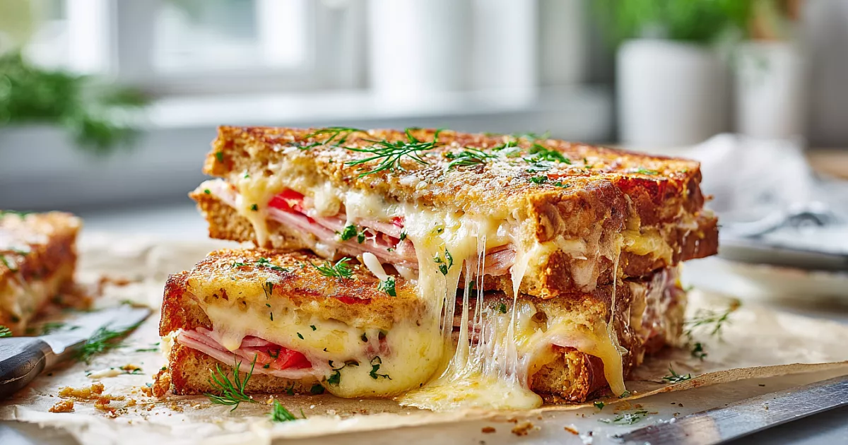 Шикарные двухэтажные бутерброды с ветчиной, сыром и помидорами получаются невероятно вкусными. Сыр тянется, начинка сочная, а корочка хрустящая. Готовятся быстро и просто.