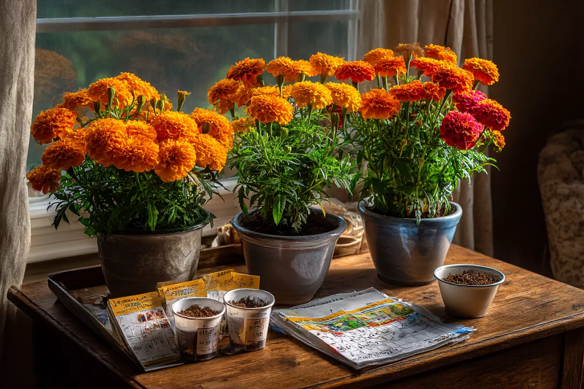 На всходы бархатцев обычно уходит 2–10 дней. Затем требуется 40–50 дней до высадки в грунт. В регионах с возможными возвратными заморозками до начала мая рассада должна быть готова к первым числам мая. Посев в начале марта даёт как раз около 60 дней — к высадке получатся крепкие кустики, которые сразу зацветут. Прямостоячие лучше сеять на 10–14 дней раньше отклонённых, но и посев сейчас не опоздание — они зацветут чуть позже, но всё равно обильно.