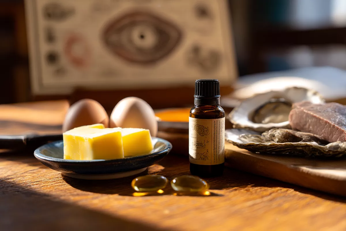 Витамин А отвечает за увлажнение глаз и здоровье роговицы. Его нехватка вызывает сухость, липкость, ночную слепоту и даже риск разрыва роговицы. Чаще всего дефицит возникает от обилия рафинированной еды или проблем с желчным пузырём — витамин А плохо усваивается. Лучшие источники — яичные желтки, печень, сливочное масло, рыбий жир. Растительные продукты дают бета-каротин, но его превращение в активный ретинол очень низкое — нужно съедать огромные порции овощей. Для работы витамина А нужен цинк: красное мясо, устрицы, печень. Рафинированные продукты и сахар цинк почти не дают.