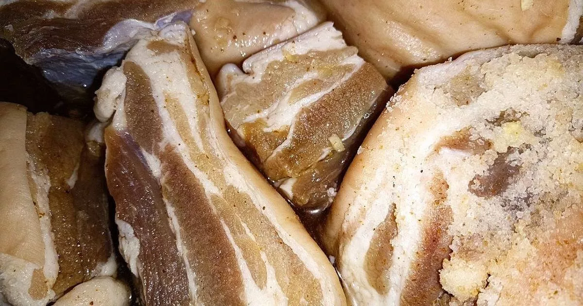 Промываем куски сала холодной водой и обсушиваем бумажным полотенцем. Выкладываем их в чистую стеклянную банку или эмалированную посуду, заливаем охлаждённым рассолом так, чтобы он полностью покрывал мясо. Закрываем крышкой и оставляем мариноваться в холодильнике или подвале е на срок от пяти до семи дней.