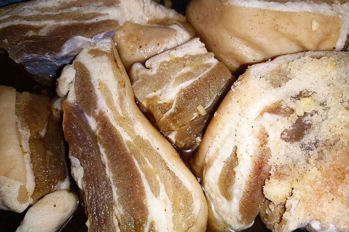 Для засолки в рассоле лучше всего использовать пузанину с мясными прожилками.