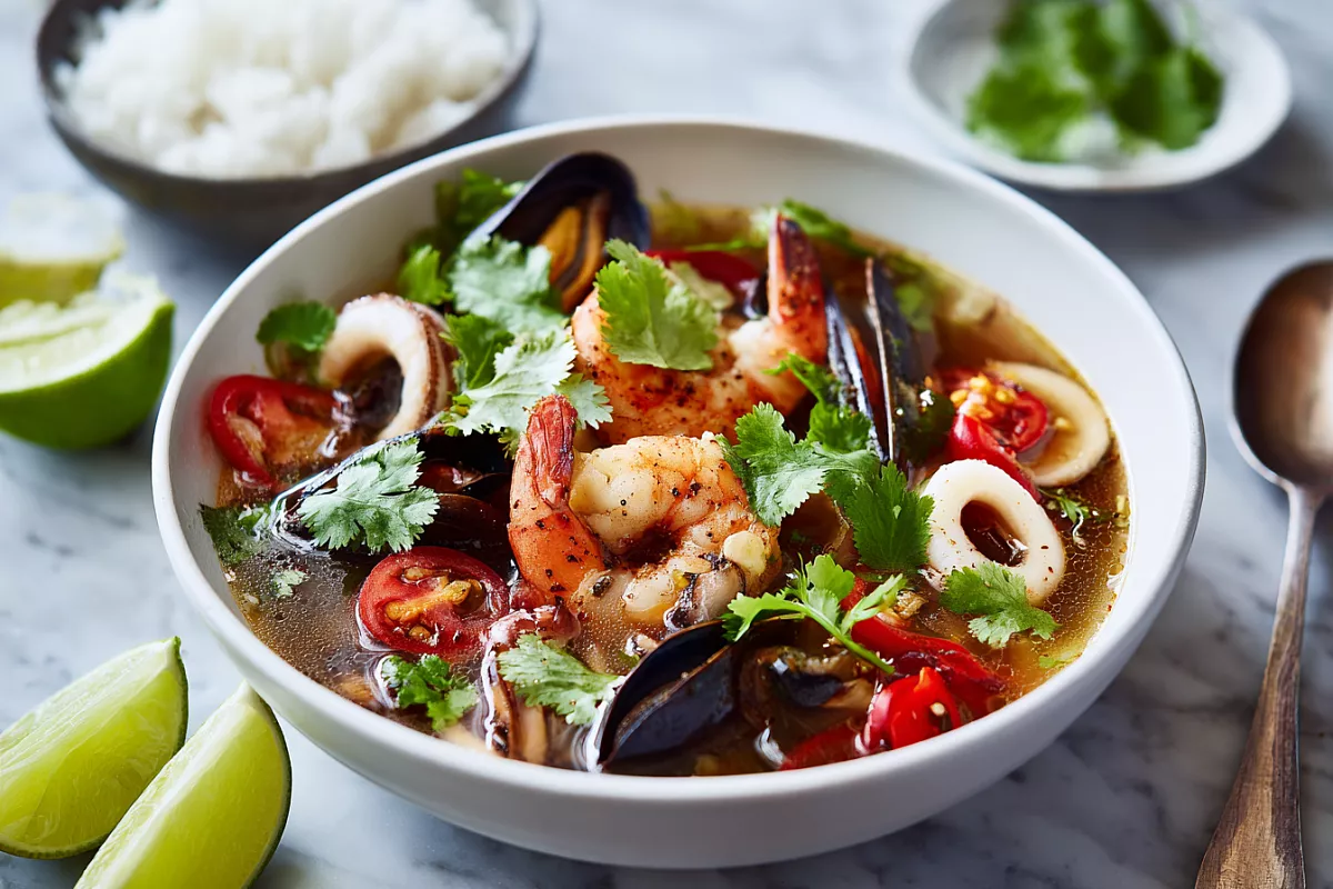 Настоящий том ям без лишних сложностей: сочные морепродукты, яркий вкус, кислинка лайма и кокосовое молоко. Готовится за 20–25 минут — целая кастрюля супа, который возвращает к жизни после праздников!
