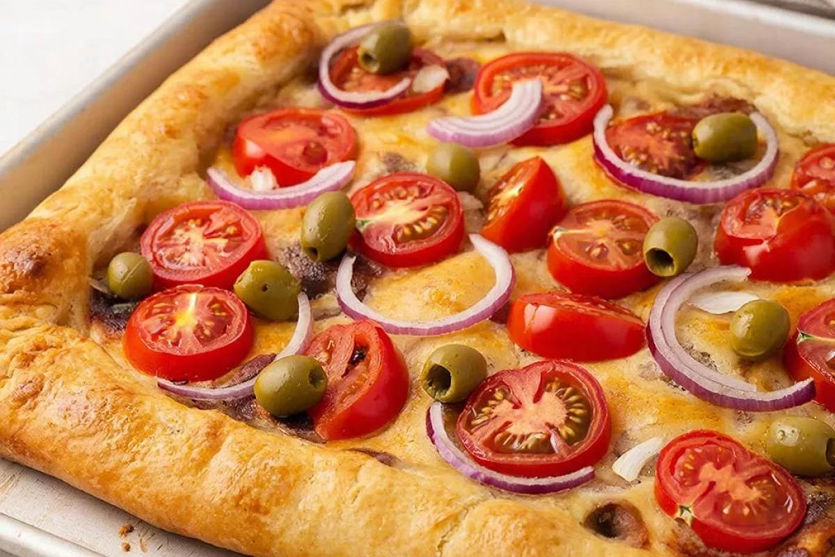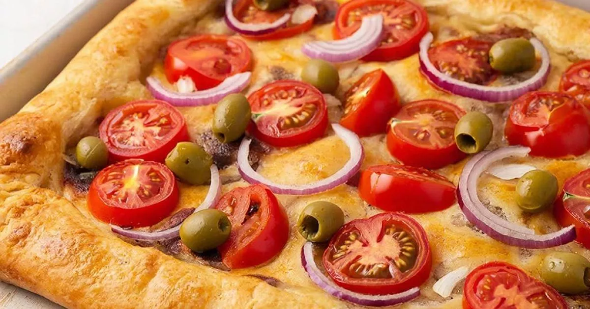 Сборка пирога: Застелите противень пергаментом или используйте форму 30х40 см, смазанную оливковым маслом. Растяните тесто по всей поверхности формы. Выложите томатный соус, равномерно распределяя его по тесту, отступая от края. Поставьте тесто с соусом в разогретую до 50 °C духовку на 30 минут. Достаньте тесто из духовки, выложите на него луковые кольца и оливки. Сверху уложите помидоры, посолите и поперчите их, добавьте каперсы. Выпекайте в разогретой до 180 °C духовке 20 минут. Достаньте пирог, смажьте его тонким слоем оливкового масла. Верните пирог в духовку и выпекайте еще 20-25 минут до готовности.