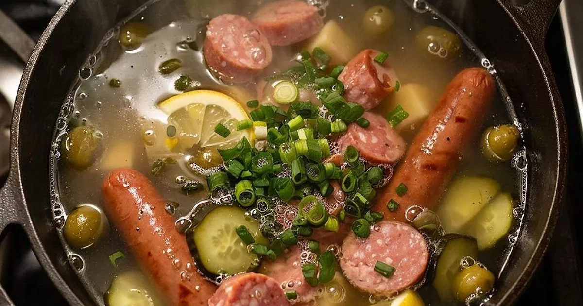 Суп получается густым и очень сытным благодаря добавлению обжаренных колбасок.