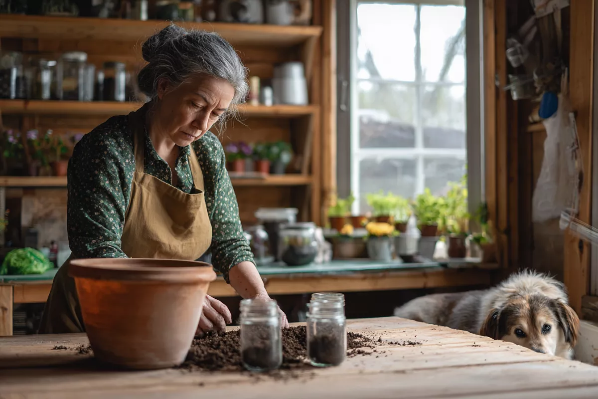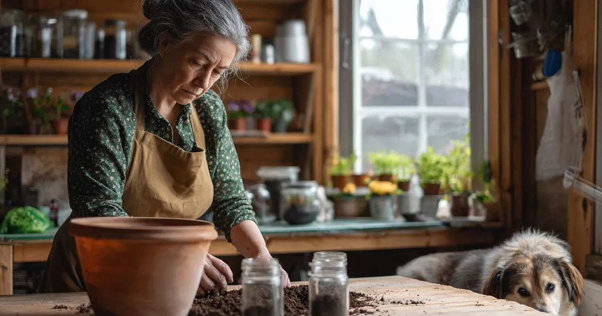 Землю беру с дачи — из теплицы или компостных коробов: рыхлая, питательная, без мусора. Просеиваю через сетку — получается воздушная, без камешков и корок, мошки не заводятся. На полведра земли добавляю большую щепотку сухого куриного помёта и столько же золы, хорошо перемешиваю.
