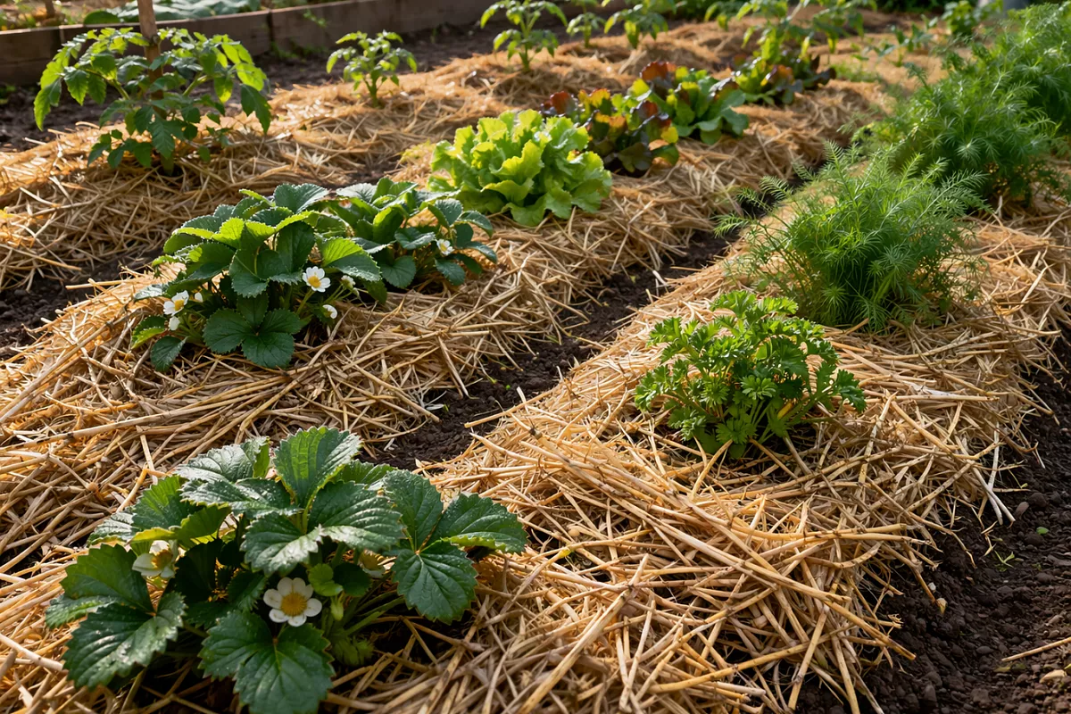 Второе — совместимость материала с растениями. Например, хвоя сильно подкисляет почву, что подходит не всем растениям. Лучше использовать солому или листья для большинства овощей, а хвоя — для кислолюбивых культур.