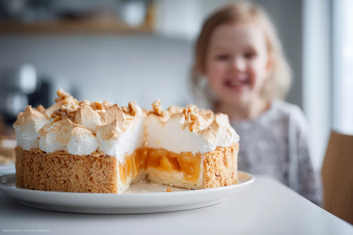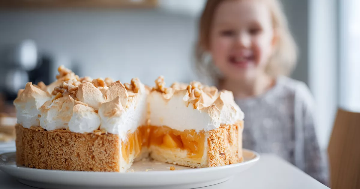 3 белка комнатной температуры взбивают со щепоткой соли до мягкой пены. Постепенно добавляют 125 г сахара и 1 ч. л. лимонного сока. Взбивают до устойчивых пиков. Для начинки используют 500–700 г очень густого персикового или абрикосового джема. Если джем жидковат, добавляют 1 ст. л. крахмала.
