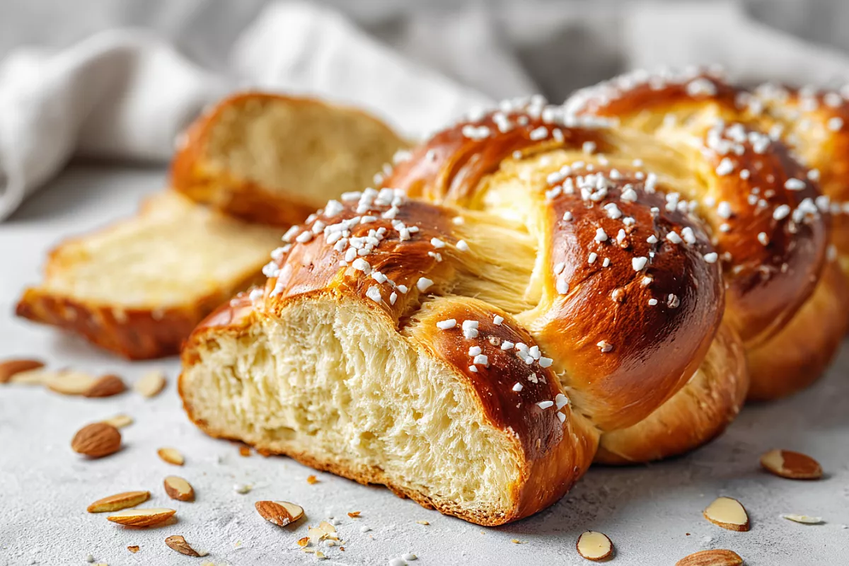 Перед выпечкой смазывают смесью 3 желтков и 3 ст. л. молока. Посыпают миндальными лепестками и жемчужным сахаром. Выпекают при 180 °C 25–30 минут для маленьких кос и 35–40 минут для большой. Готовность проверяют деревянной шпажкой.