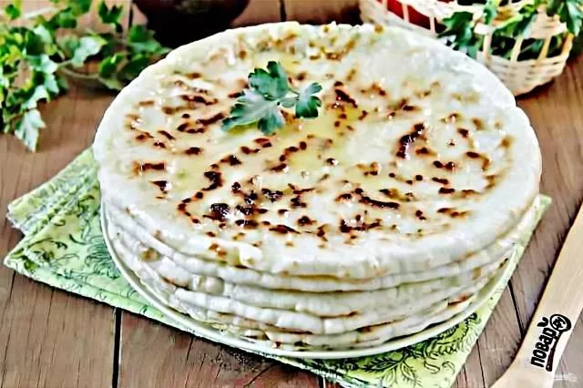 Обжариваем хичины на разогретой сухой сковороде по 3–4–5 минут с каждой стороны. Готовыми они считаются, когда тесто становится белым. Во время жарки они могут надуваться — в этом случае нужно поднять их и подождать, пока они не сдуются, а затем продолжить жарить. Лепешки с картофелем можно проколоть вилкой, чтобы они не надувались, а вот с сырной начинкой это сделать сложнее. Готовые хичины складываем друг на друга и щедро смазываем растопленным сливочным маслом.
