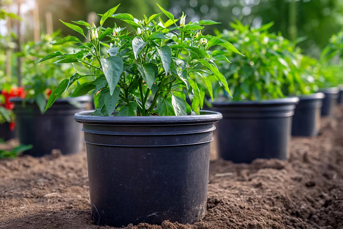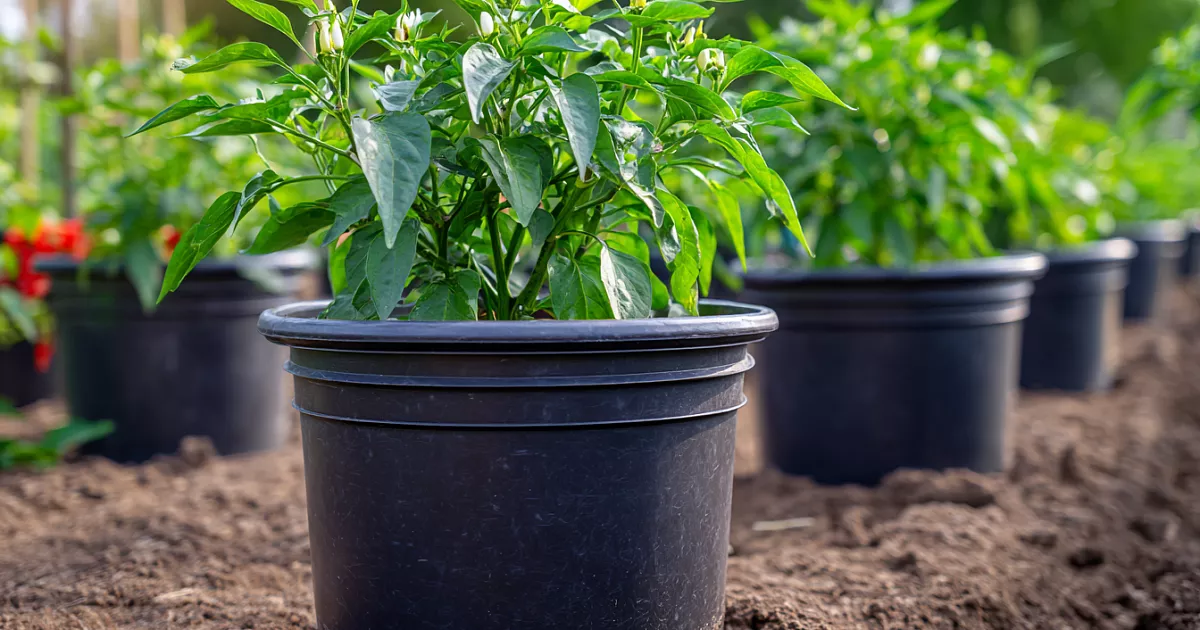 Получить ранний урожай перца можно, если пересадить рассаду в горшки объёмом 3–5 л. Этот метод позволяет растениям быстро укорениться в прогретой земле и отдать первые плоды намного раньше.