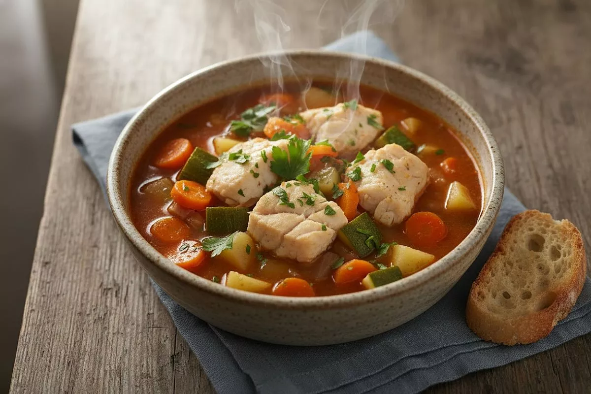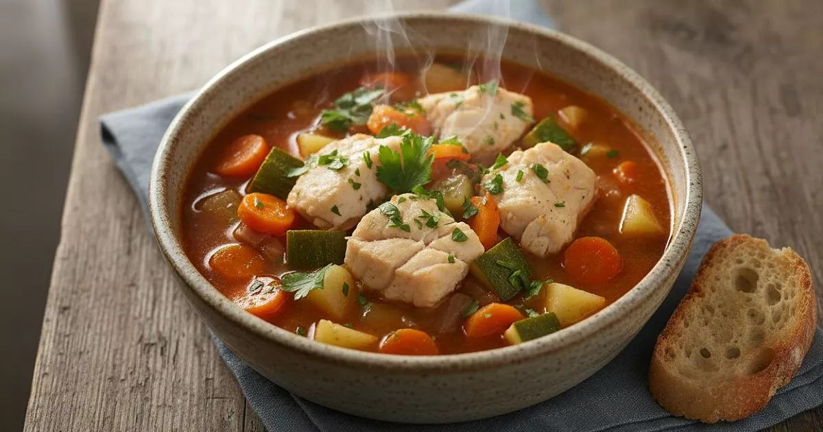 Как приготовить? Обжарьте нарезанный лук и чеснок на оливковом масле. Добавьте нарезанный кубиками картофель, томаты и бульон. Тушите 15 минут до мягкости картофеля. Затем аккуратно добавьте рыбу, не перемешивая слишком активно. Готовьте ещё 5-7 минут.