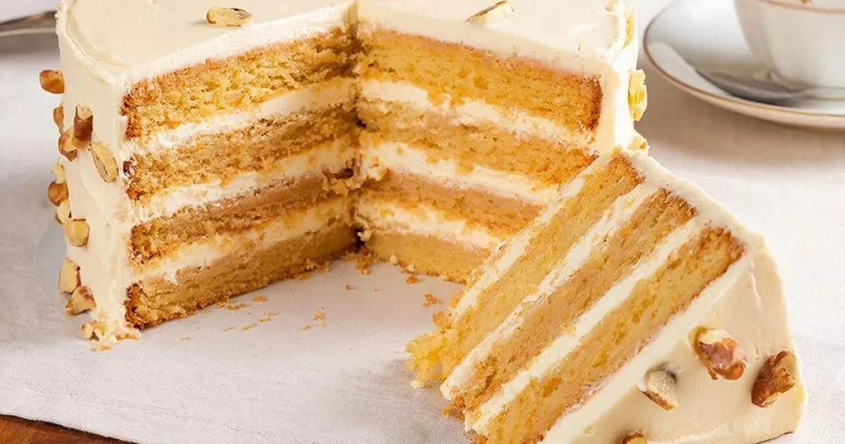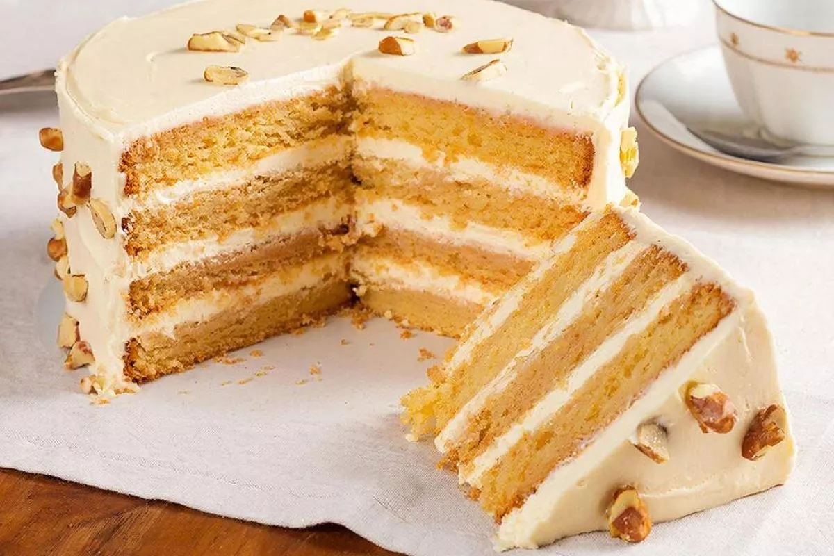 Сборка торта: Визуально разделите крем на 6 равных частей. Покройте первый корж 1/6 частью крема. Сверху уложите второй корж. Повторите процесс, чередуя коржи и крем, пока не соберете весь торт. Всего получится 6 коржей и 6 слоев крема. Верхний корж также покройте кремом. Уберите торт в холодильник на 5–6 часов (лучше на ночь), чтобы он пропитался и стабилизировался.