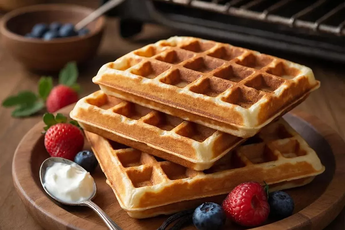 Разогрейте вафельницу или гриль до 180°C. Сформируйте из теста небольшие шарики (примерно по 50 г) и выложите их на разогретую поверхность. Выпекайте до золотистой корочки и полной готовности. Подавайте вафли теплыми с любимым топпингом: свежими ягодами, йогуртом, медом или вареньем.