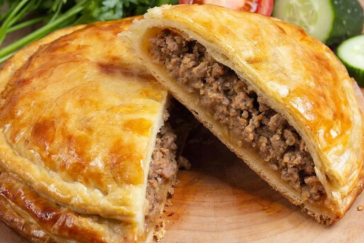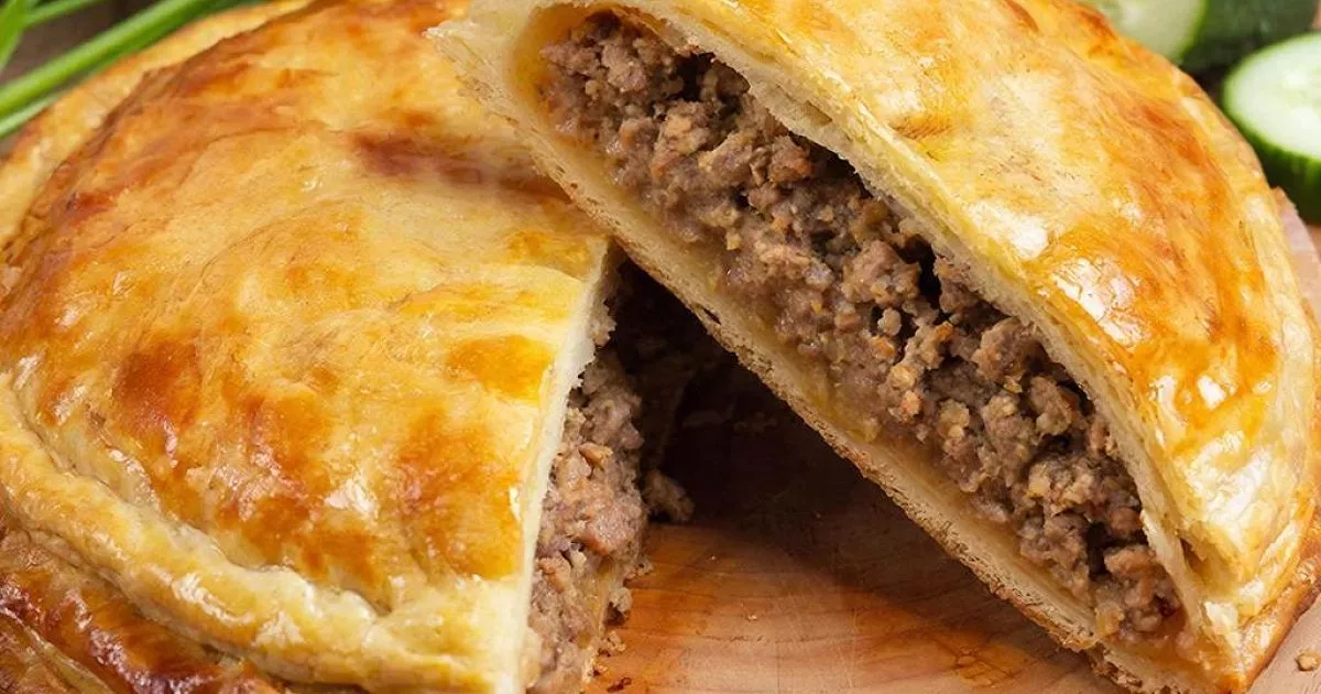 Ингредиенты: Слоеное тесто (0,5 кг); сливочное масло (для смазывания); 1 луковица (мелко нарезанная); 1 чайная ложка сушеного базилика; 300 г мясного фарша (говядина, курица или свинина); соль и черный перец (по вкусу); 100 г тертого сыра (моцарелла, чеддер или другой); 1 пучок петрушки (мелко нарезанный); 2 вареных яйца (мелко нарезанные)