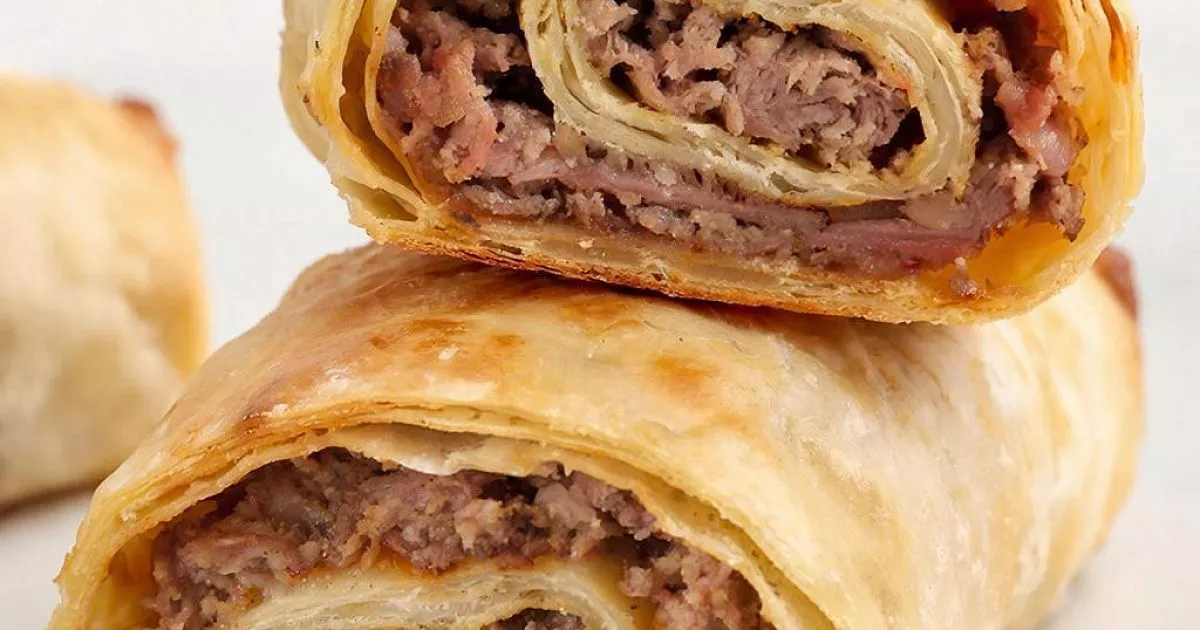 Посыпьте стол мукой и раскатайте размороженный пласт слоеного теста в прямоугольник размером примерно 31 на 27 сантиметров. Равномерно распределите мясную начинку по раскатанному тесту, оставляя по 2 сантиметра от краев. Сверните пласт с фаршем в рулет, аккуратно скрепляя края. Выложите рулет швом вниз на противень, застеленный пергаментной бумагой или специальным листом для выпечки.