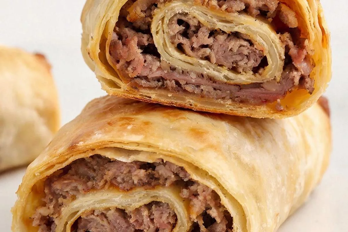 Ваш мясной рулет из слоеного теста готов! Немного остудите его, нарежьте на кусочки и подавайте к столу. Приятного аппетита!