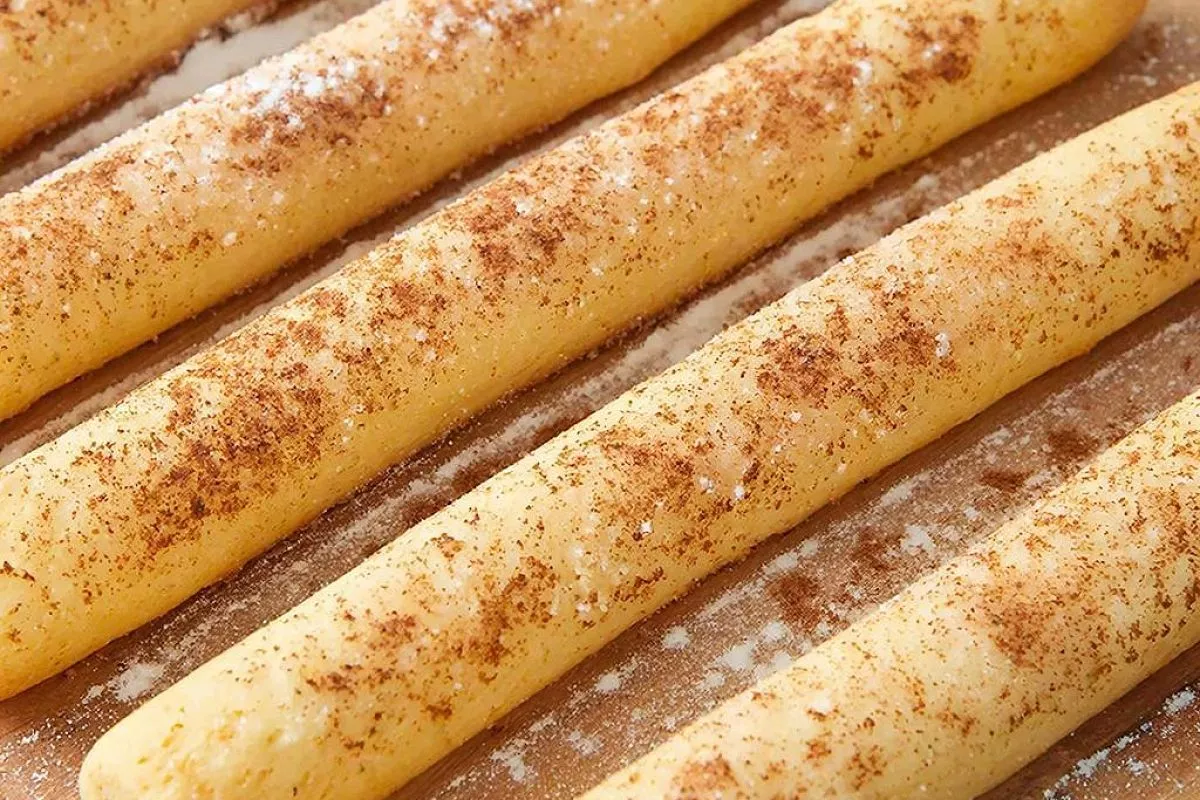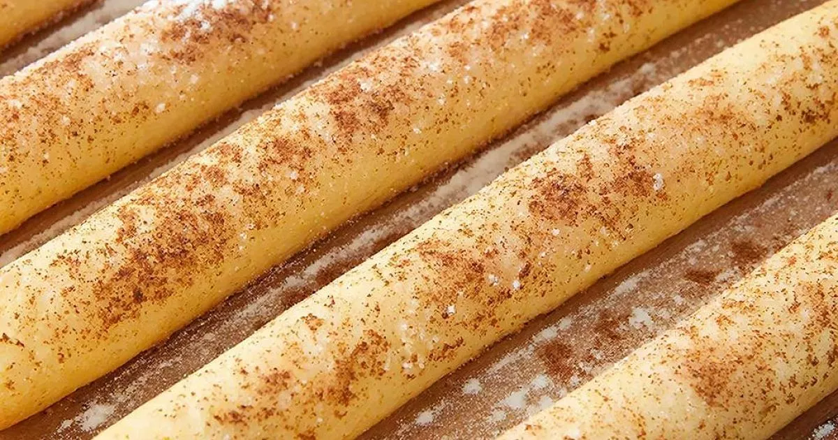 Каждый кружок присыпьте сахаром и молотой корицей, затем сверните в тонкую трубочку. Выложите заготовки на противень, оставляя между ними достаточно места. Разогрейте духовку до 180 градусов и выпекайте трубочки в течение 15 минут.