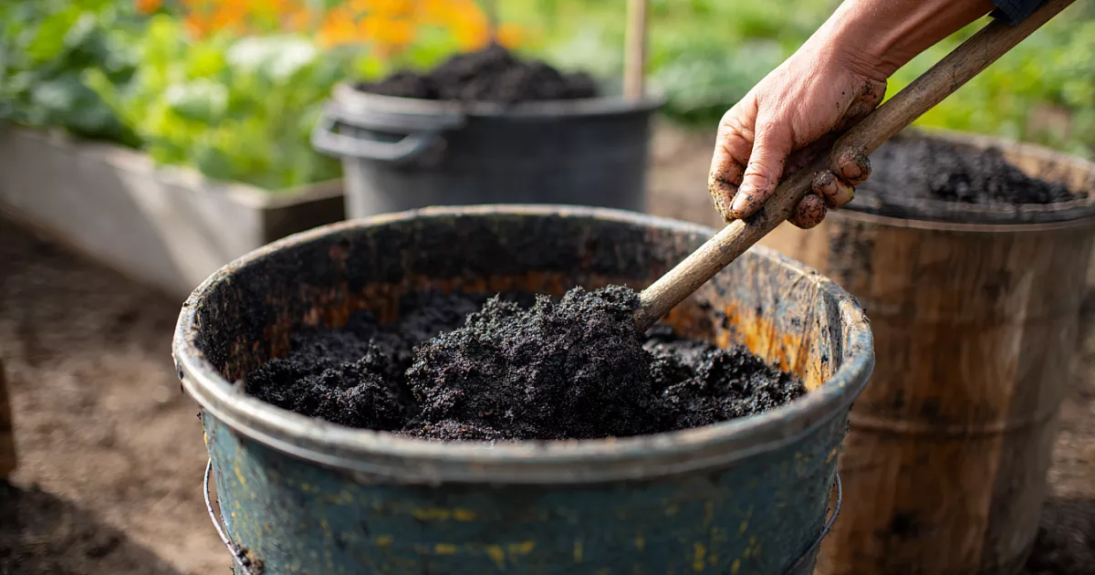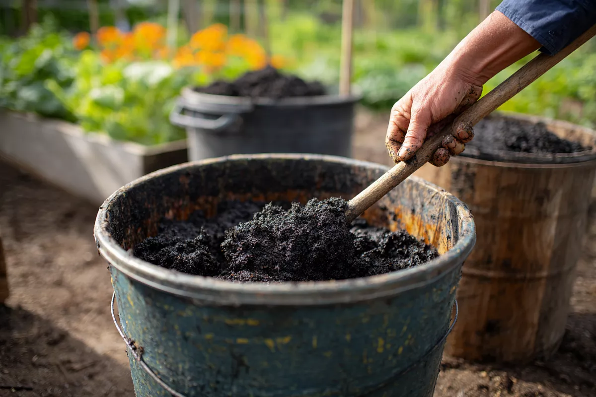 В 10-литровое ведро насыпаем 10 л куриного помёта (по объёму). Заливаем 10 л воды. Добавляем 500 мл препарата Байкал ЭМ-1. Тщательно перемешиваем. Ставим в тёплое место (около 18–20 °C). Через 3–4 дня раствор забродит, появится пена и характерный запах. Готовый концентрат разводим 1:10 перед использованием.