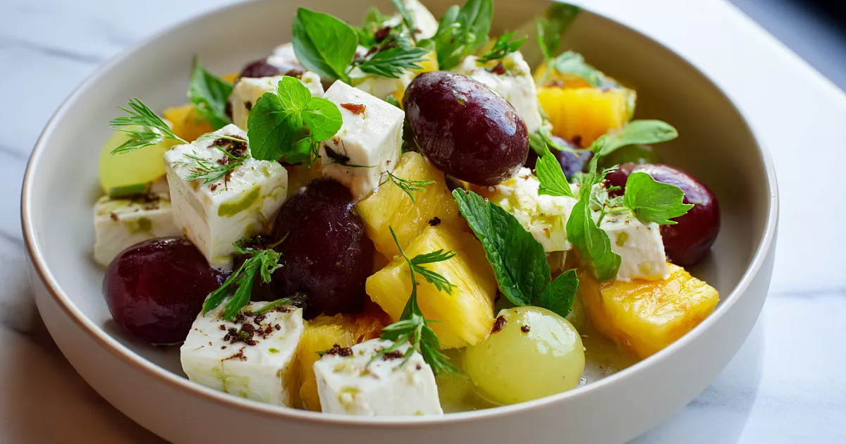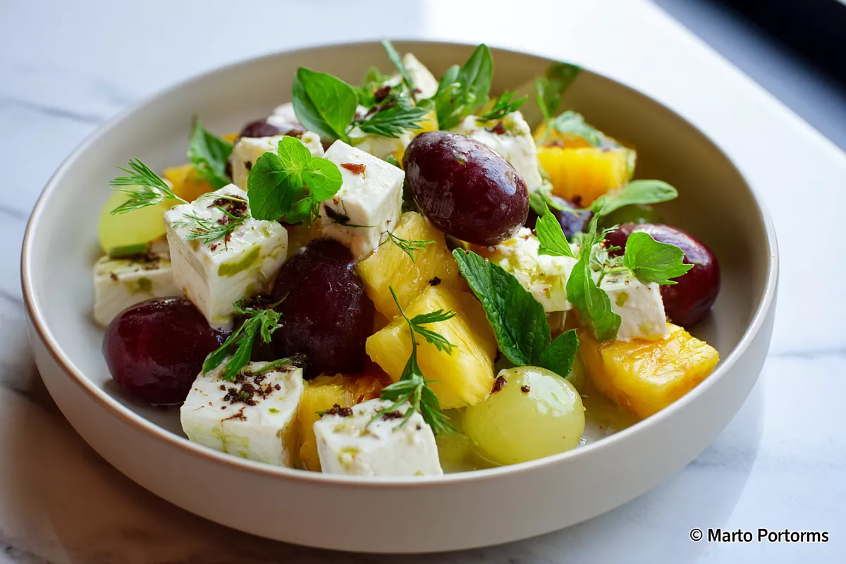 Салат получается ярким, сочным, с приятным сочетанием солоноватого сыра, сладкого ананаса и винограда. Чеснок добавляет лёгкую пикантность, не перебивая остальные вкусы.