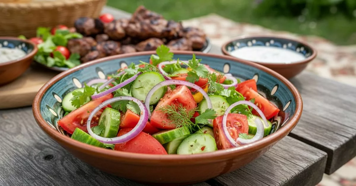 Такой салат идеально дополняет шашлык, создавая гармоничное сочетание свежести овощей и насыщенного вкуса мяса. Грузинская заправка придает блюду особую пикантность.