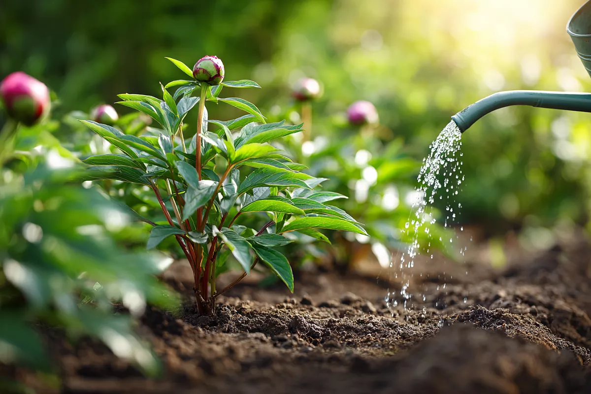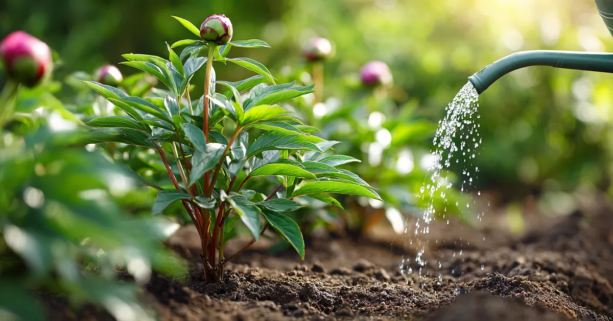 Пионы очень любят влагу, особенно в период роста побегов. Если почва сухая, поливаем обильно (2 ведра воды под молодой куст). Вода должна хорошо пропитать корневую зону. Если почва уже влажная, полив пока не нужен.
